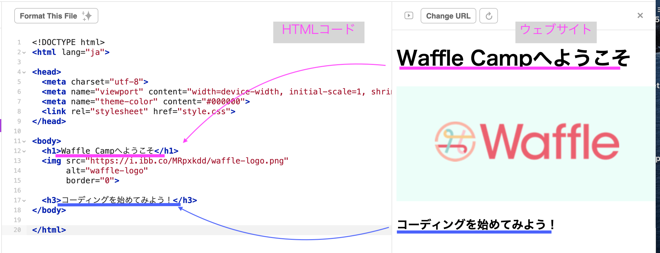 よくみてみると、「左側のHTMLで書かれている文字が右側のウェブサイトに表示されている!」ということに気づきます。どうやら、文字はそのまま表示されるようです!