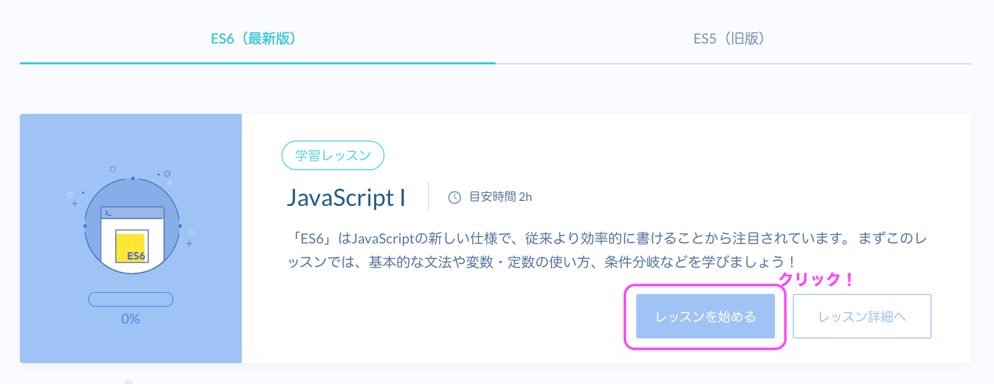 今回の宿題は「JavaScript I」です。「レッスンを始める」をクリックして早速始めてみましょう!(所要時間:2時間)
