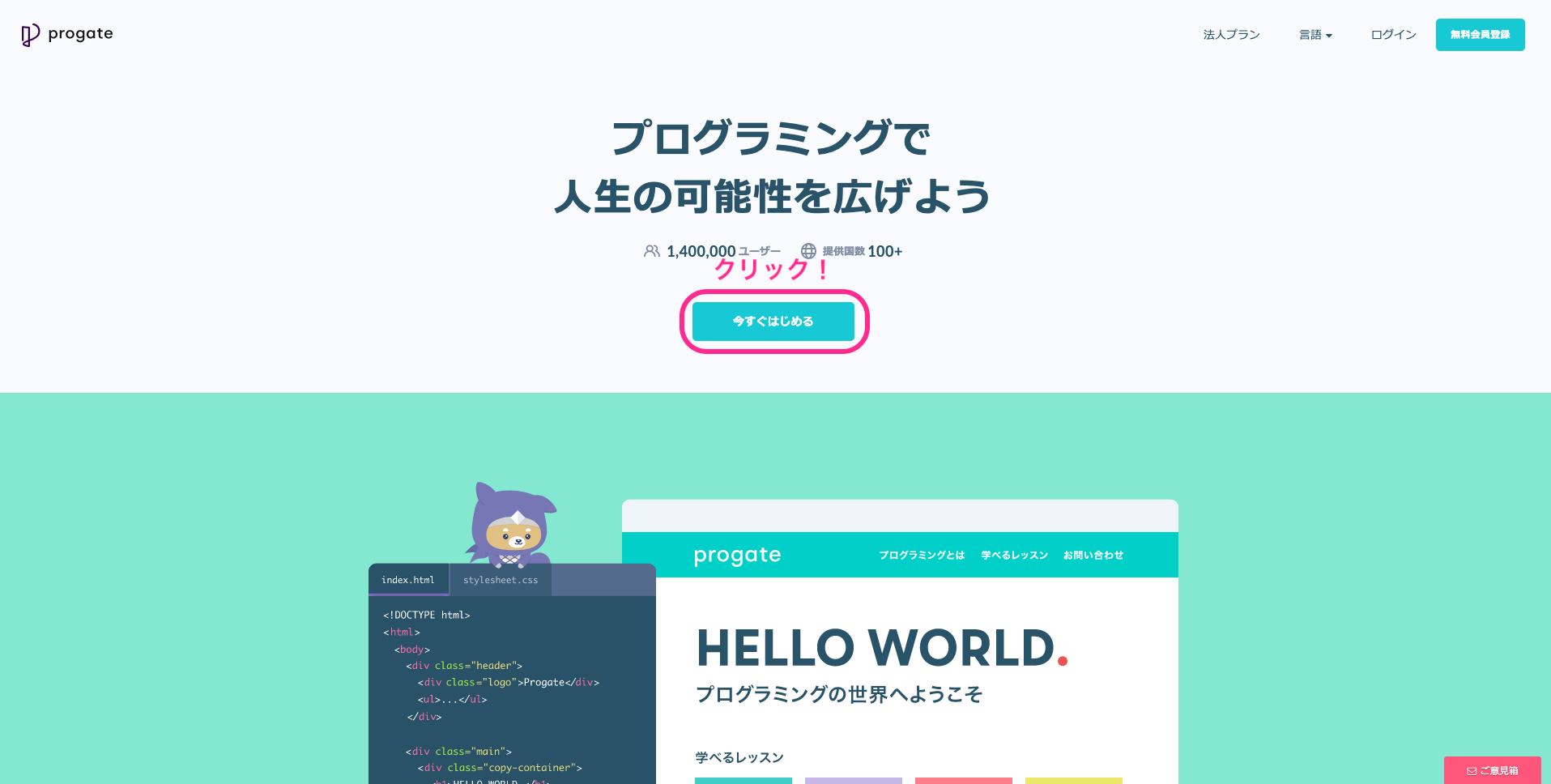 この課題は、Progate(プロゲート)というオンラインのプログラミング学習ツールを使って行います。以下のリンクからProgateを開き、手順に沿って登録して下さい。