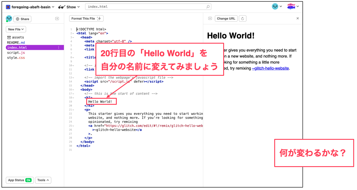 20行目の「Hello World」を自分の名前に変えてみましょう