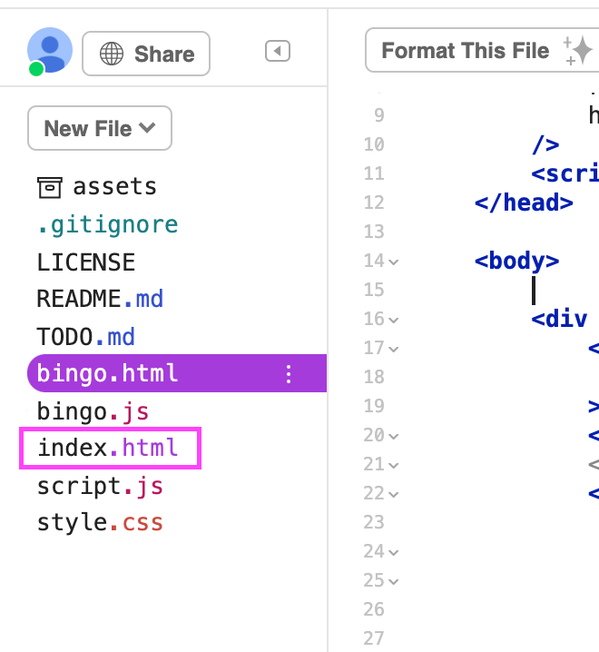 < Glitchで bingo.htmlの確認方法 >