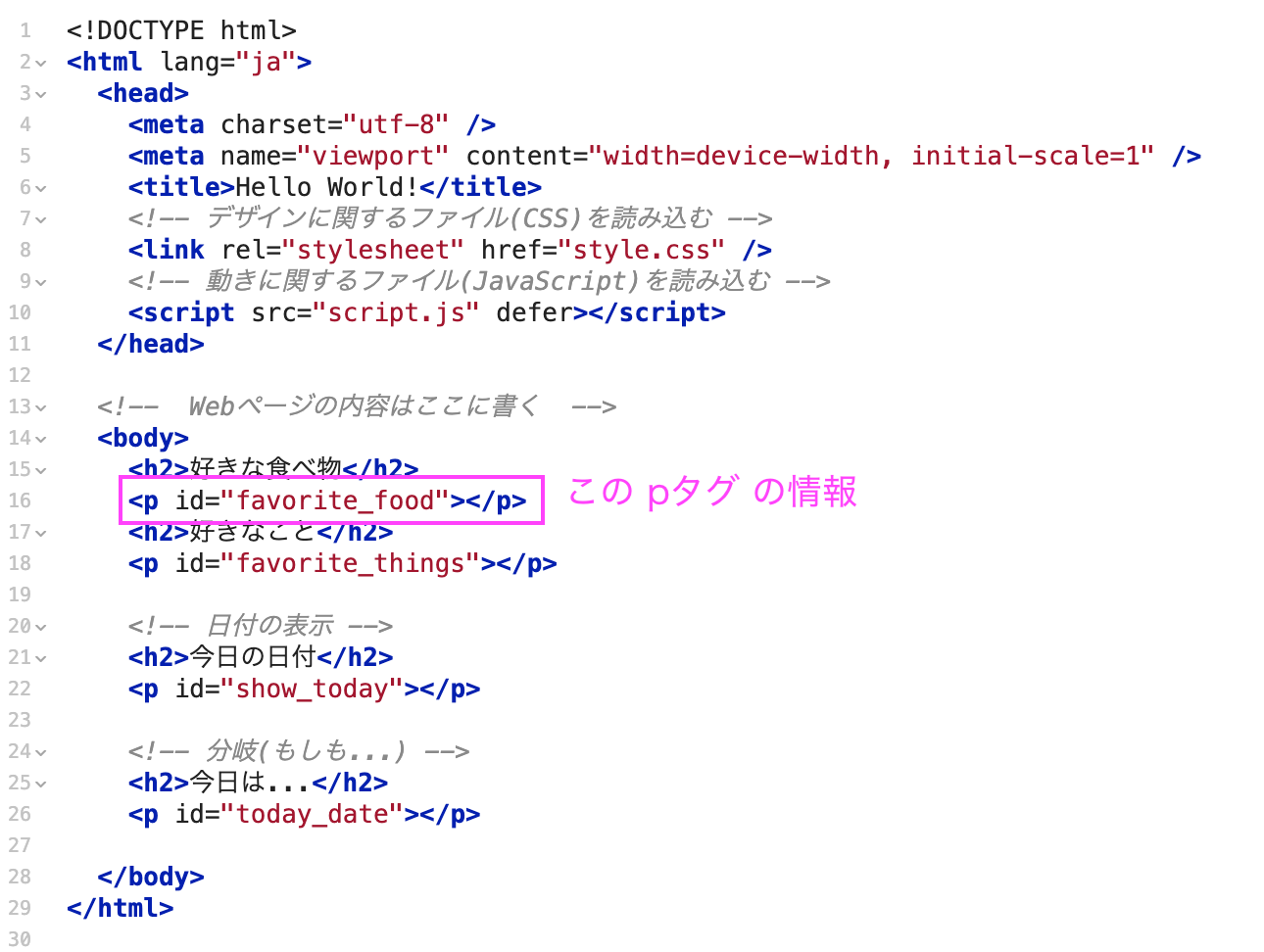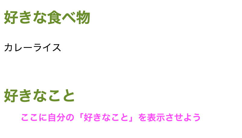 // 好きな食べ物の情報を入れる// 文字を入力するときには、" " で囲むよfavorite_food.innerText = "カレーライス";コメント#